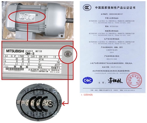 三菱電機已取得中國CCC認證,認證產品有三菱電機,三菱減速機及三菱工控產品. CCC認証取得機種 【電圧/周波數】 380V/50Hz 220V/50Hz 210V/60Hz 230V/60Hz 200/200/220V 50/60/60Hz 400/400/440V 50/60/60Hz ※インバータ定トルク品は対応できません。 【標準仕様】 項目 GM-S GM-SSY GM-SHY GM-D 出力 0.1、0.2、0.4、0.75kW 0.4,0.75kW 減速比 1/3~1/200 但し0.75kWは 1/3~1/450 1/7.5~1/60 1/5~1/240 1/3~1/1200 定格 連続 耐熱クラス E 保護構造 屋內形 及び 屋外形 ブレーキ なし、付き 適合規格 GB1350-2000 CCC認証制度とは WTO加盟(2001年12月)に伴い ?中國國家進出出口商品検験局「CCIB認証」 ?中國電気機器適合性認証委員會「CCEE認証」 が組織統合され、CCC認証制度が開始されました。 2003年8月以降、対象品目でCCCマークが無い電機機器は、中國國內での販売ができなくなりました。 対象品目リストの中に「小電力(出力)モータ」がありモータ容量1.1kW以下のギヤードモータが含まれます。