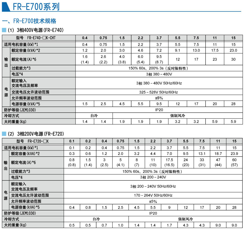 三菱變頻器FR-E700技術(shù)規(guī)格