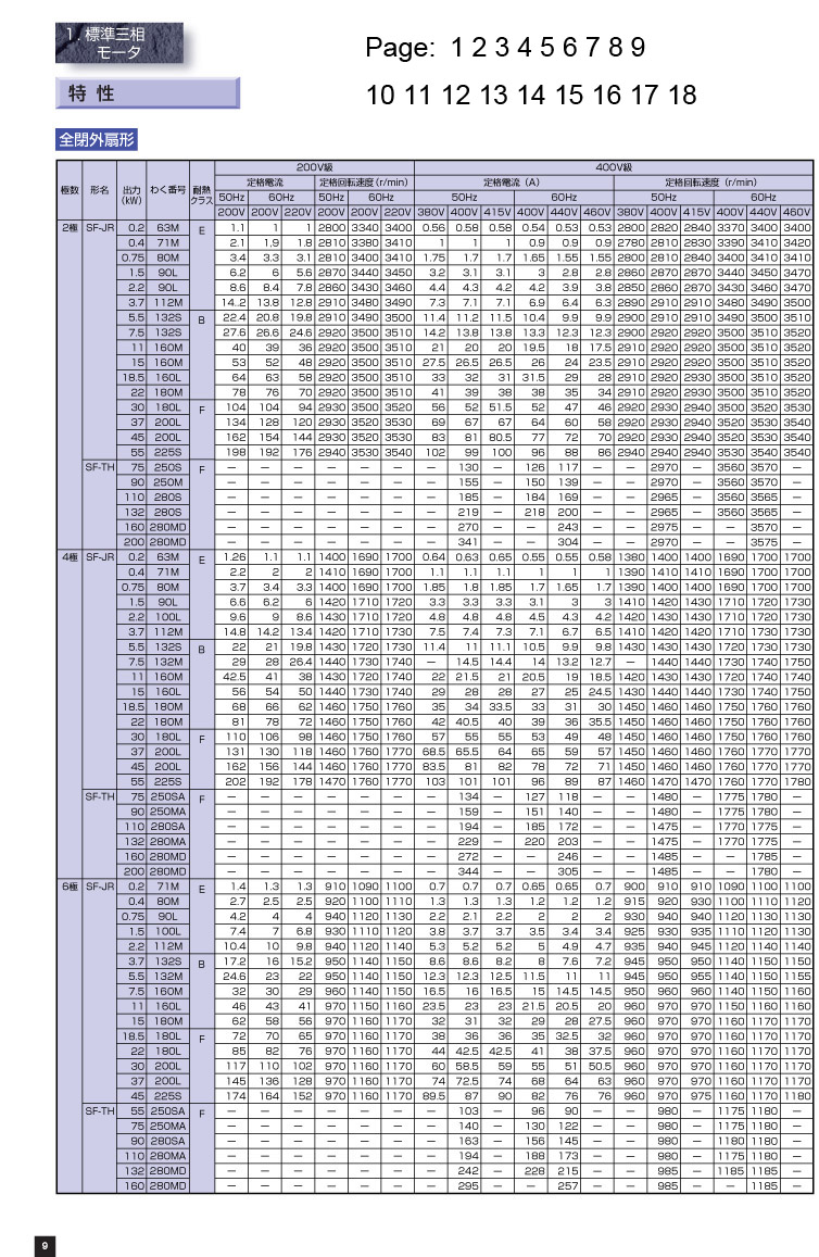三菱電機全閉外扇型SF-JR/SF-TH的功率,電壓,電流,頻率及轉速等工作參數.
