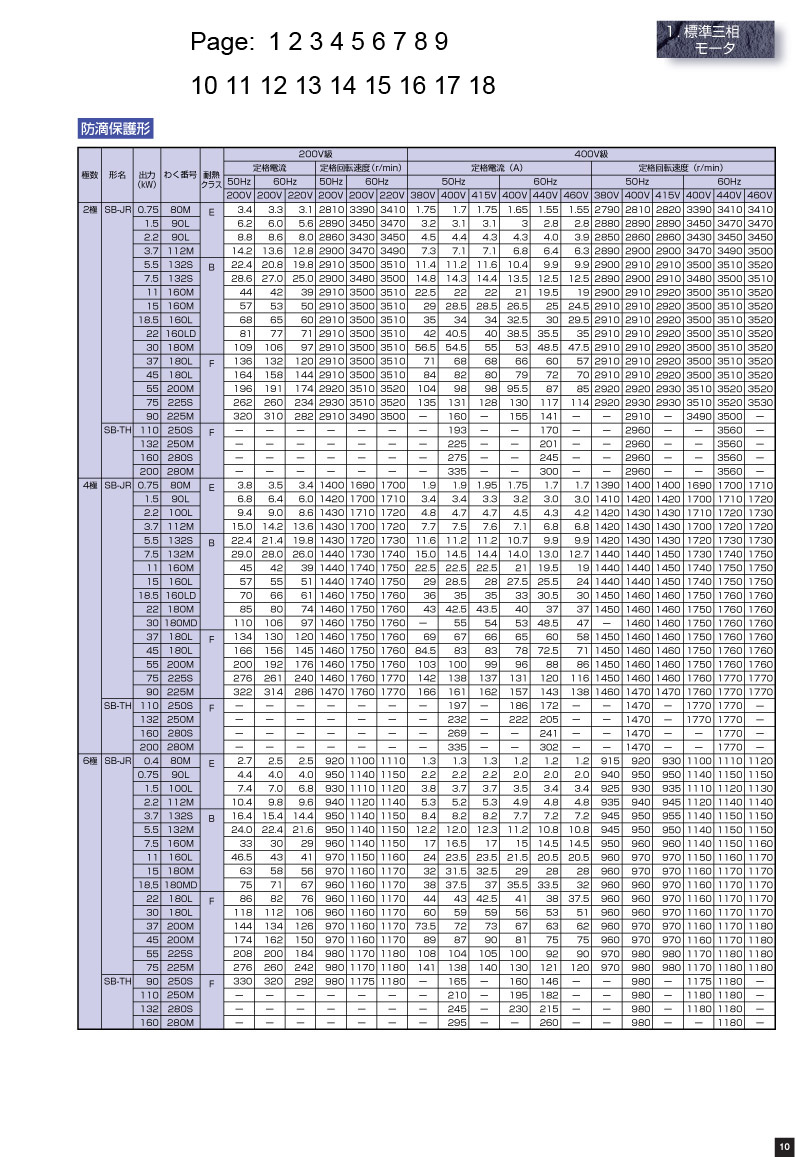 三菱電機防滴保護型SB-JR/SB-TH的功率,電壓,電流,頻率及轉速等工作參數.